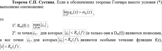 … Первое из утверждений теоремы Монтессу де Боллора и теорема фабри об отношении дали основание для одной гипотезы (обратного характера), высказанной А.А. Гончаром, о том, что регулярное поведение нулей знаменателей аппроксимаций в какой-то строке таблицы Паде степенного ряда должно и задавать расположение особых точек мероморфного продолжения степенного ряда. Им же в работе «Полюсы строк таблицы Паде и мероморфное продолжение функций» (Математический сборник АН СССР, 1981, т.115(157), №4(8), с. 590-613) эта гипотеза была подтверждена красивым результатом.